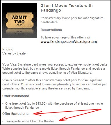 The top-of-the-line credit card from Visa is the Visa Signature card. Among its benefits are discounts for various purchases, including a generous buy one, get one free movie ticket offer from Fandango.com . All you do is enter the first six digits of your Visa card on their website to see if you are eligible for the free ticket. (Bargain hint: some non-Signature Visas work too.)
