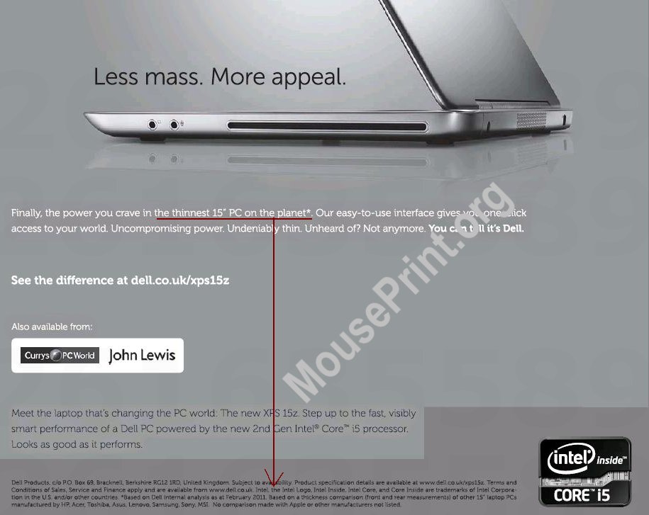 Taking a page from the advertising tactics that we have reported on here, Dell omits computers in the comparison that might actually be thinner than their own. That is like Alamo claiming they are the biggest rental car company* (*if you don’t count Hertz and Avis).