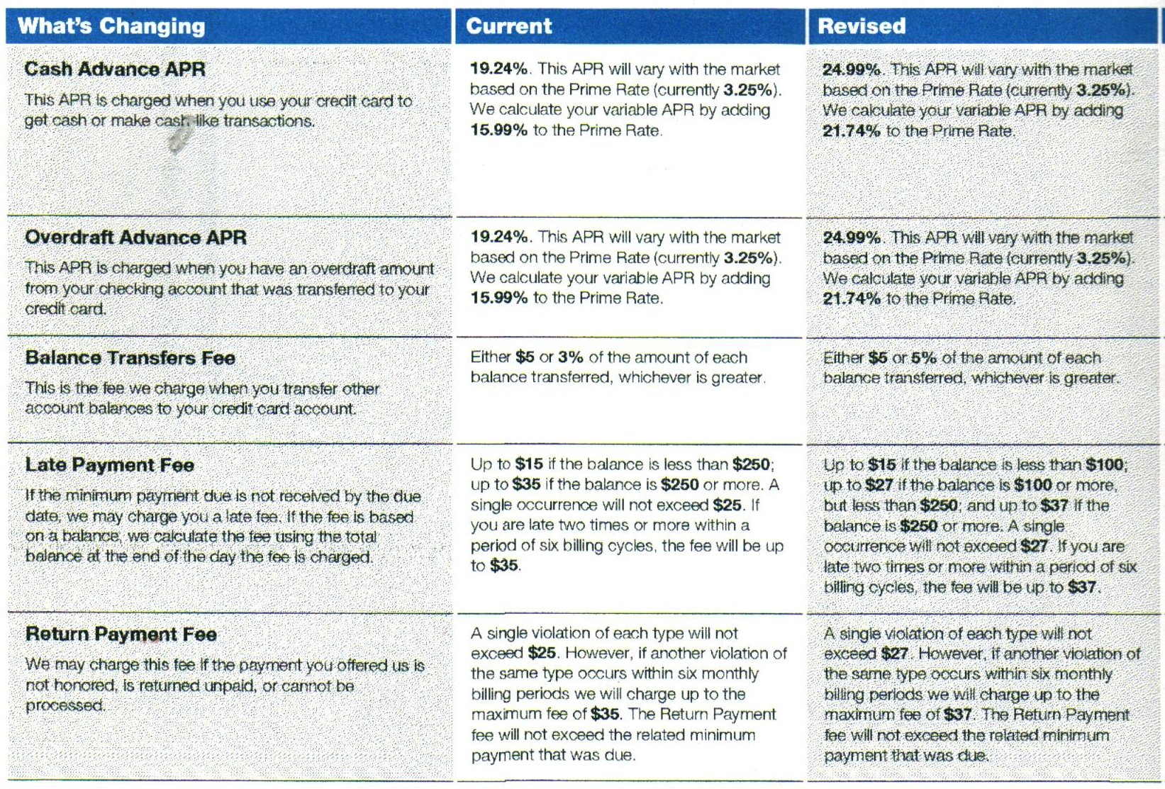 They actually show you, side-by-side, what the old terms were and what the new terms will be. It certainly doesn’t convey good news, with finance charges jumping over five percent, and late fees going up as well. But, at least the cardholder wasn’t left in the dark about what exactly they were doing. A big hat-tip to Chase.
