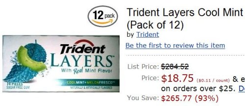 Amazon claims the list price for those 12 packs of gum is a whopping $284.52 — that’s $23.71 for a single package! Was this gum previously chewed by Elvis, thus accounting for its premium price? The full price for one pack of Trident Layers is $1.49 (at Kmart), so 12 packs should be about $17.88 full price, not almost $285. Clearly something is not right here. Is this an isolated incident? Unfortunately no. Item after item listed in the 90% off section had grossly exaggerated list prices that bear no relation to real world regular prices.