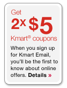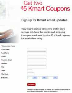 When visiting either Kmart’s website or if you have a Sears card, you might see a promotion to get two free $5 coupons when you sign up for their email list.